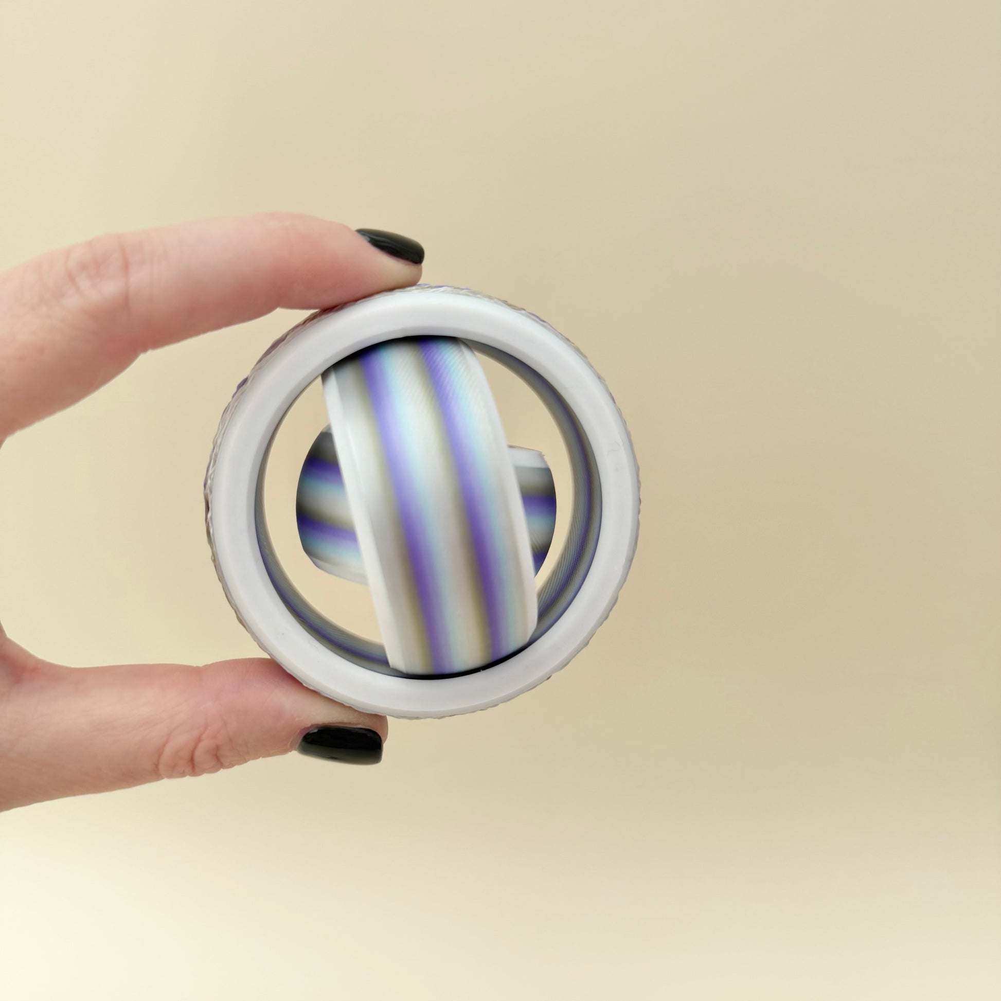 Meet the Gyro Fuzz Quad: a Gyro • Quad (4) with four nested rings and a fuzzy-textured outer edge for extra grip and tingly thumb rolls. It’s a chunky unit at 7 cm wide, 2.5 cm tall, printed in muted tones violet/white gradient that swirls as it spins. The rotation is quiet (no metal bearings), balanced, and very pocket-to-desk friendly.