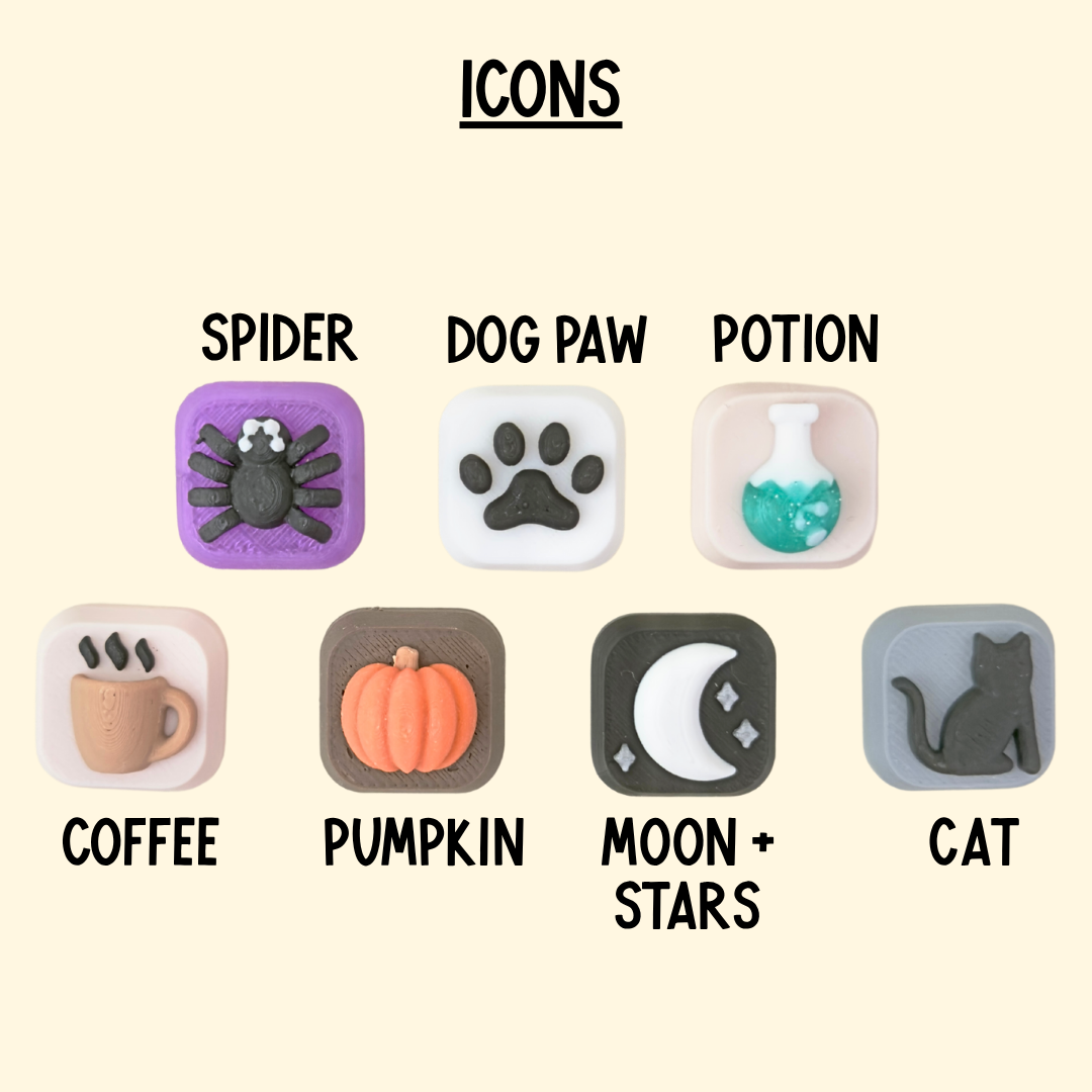 Build three tiles your way and set Clicky/Quiet per tile. One spot for click noise, repeatable push-back for rhythmic presses, and loads of visual texture to focus on. Icons are fixed-colour tiles; Textures & Letters can be any tile colour. Wrist strap or silver loop included. Not user-swappable.