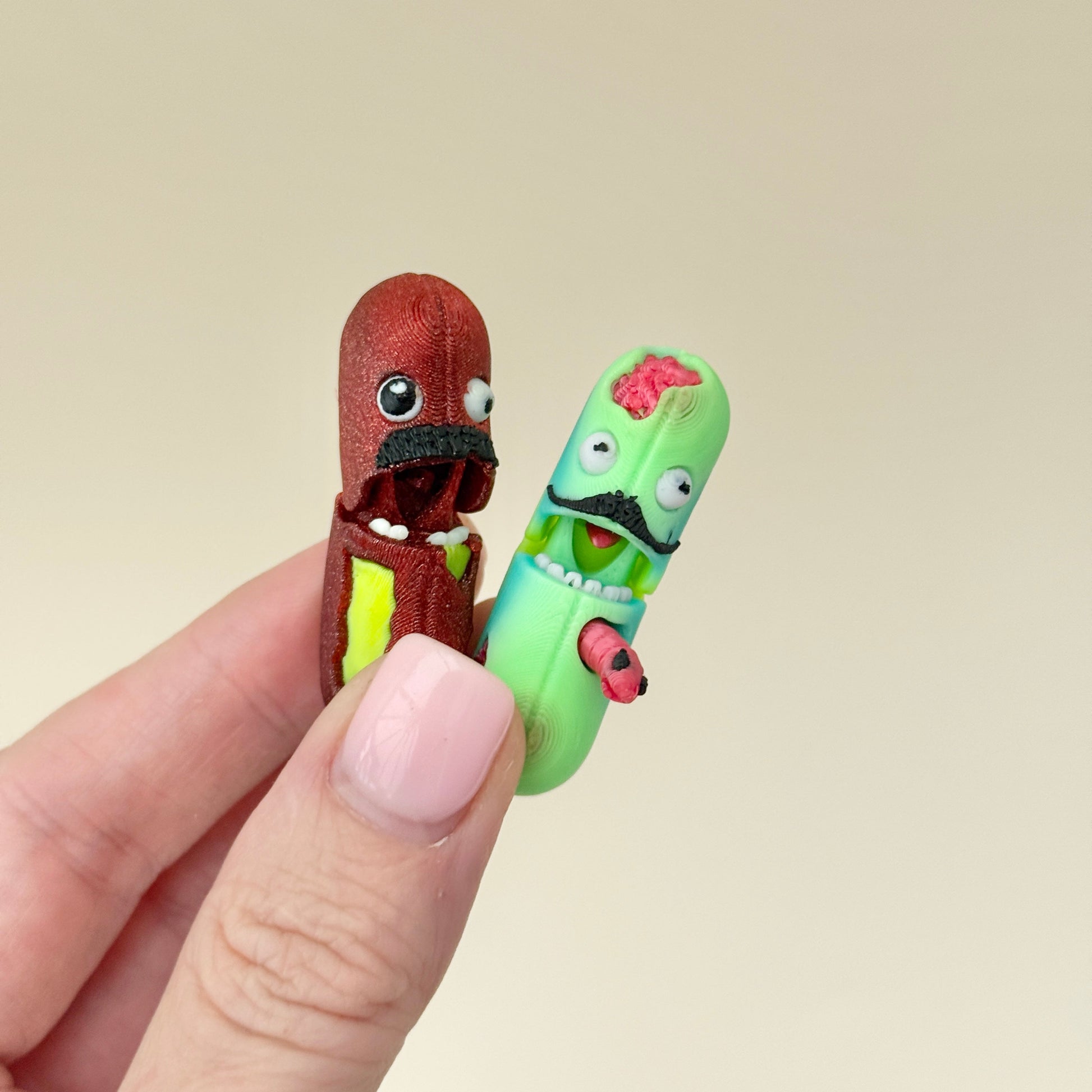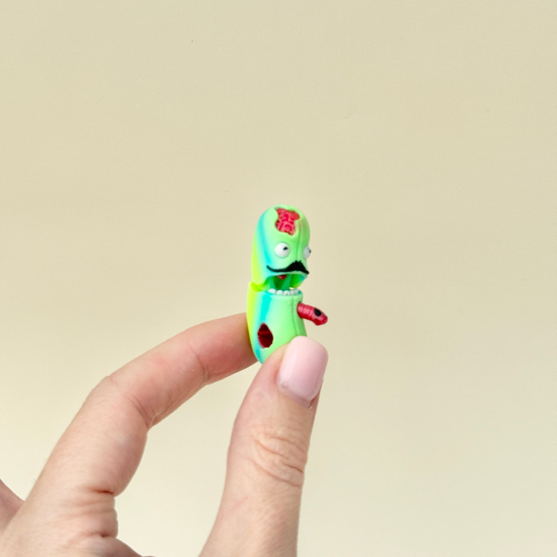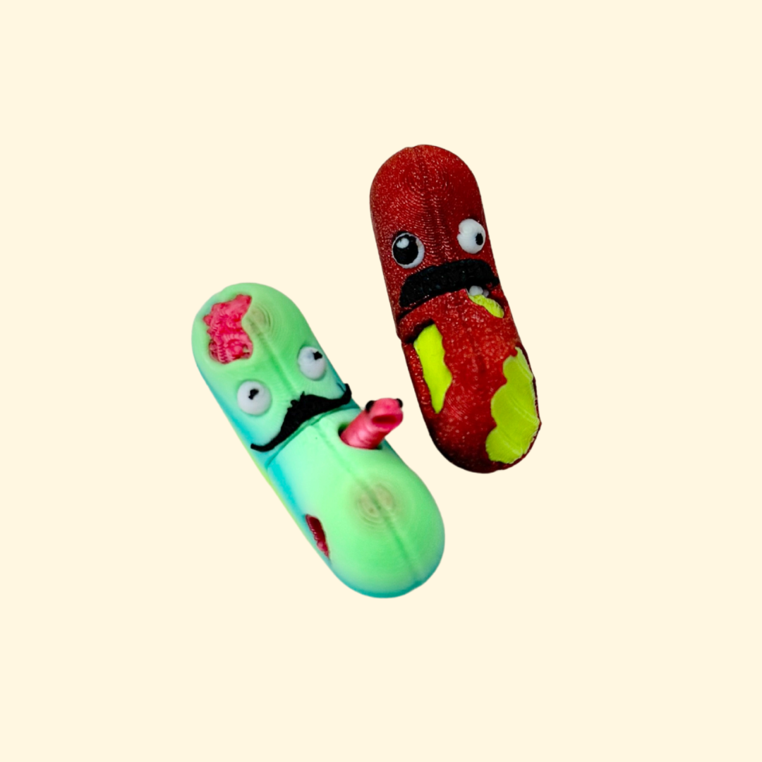 ZomBeans are tiny 4 cm novelty fidgets with hinged mouths that open and close for a cheeky, quiet tap. Each bean is packed with ridiculous detail (stitches, splats, moustaches); the green-blue bean has a worm poking from a wound—properly grim in the best way. They’re more “fun desk chaos” than serious tool, with big 80s/90s pocket-toy vibes that adults will recognise. Design by Mzm.